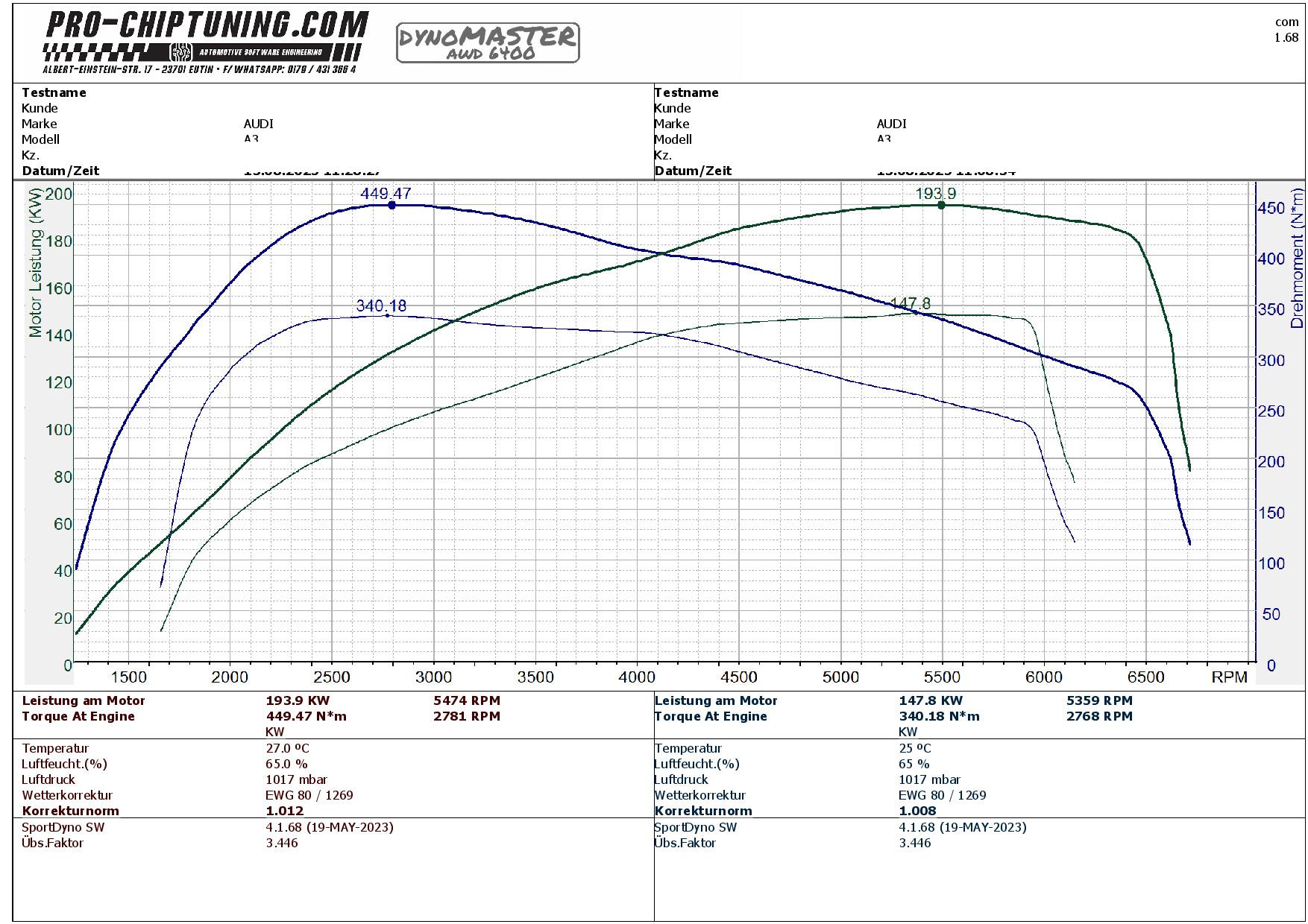 Der A3 hat noch unser Turbo-Inlet mit Teilegutachten verbaut bekommen, danach haben wir die Steuergeräteanpassung durchgeführt. Wir konnten eine Endleistung von 264PS und 450Nm Drehmoment erreichen.