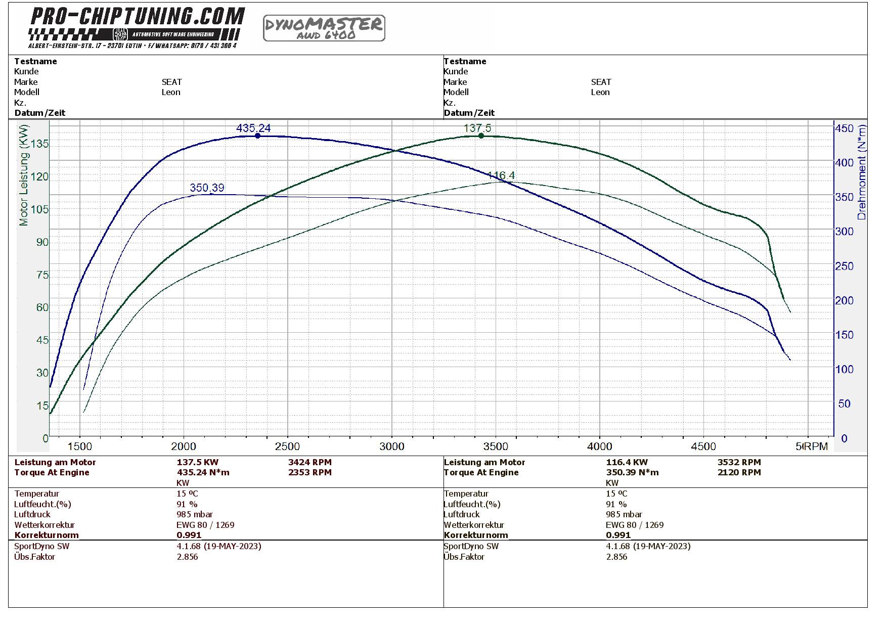 Leistungssteigerung für diesen Seat Leon - (Baujahr 2015). Der CRM - Motor (2,0TDI) leistet 150 PS (320 NM Drehmoment) im Serienzustand / Werksangabe. Da geht natürlich noch etwas mehr!