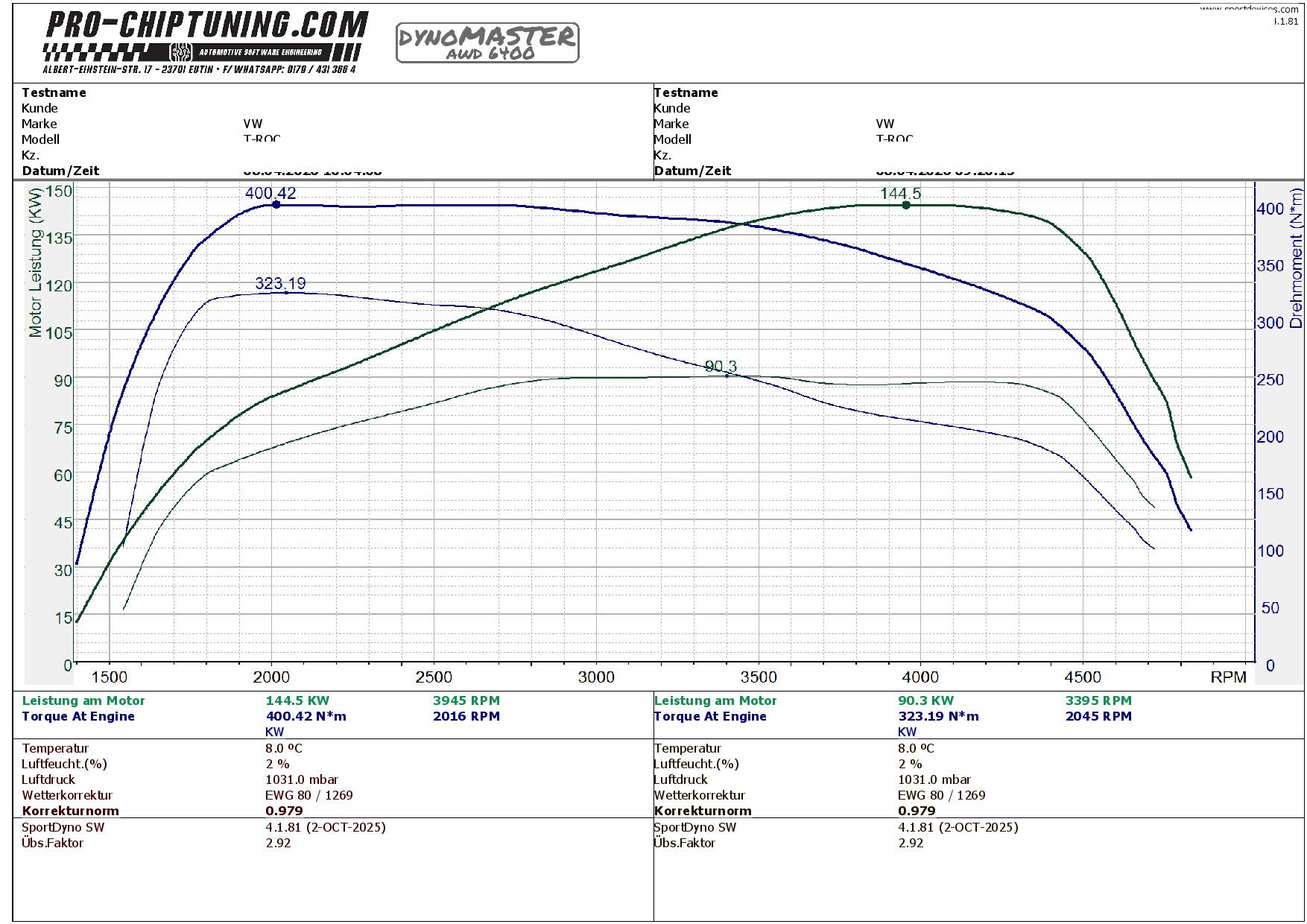 Leistungssteigerung für diesen VOLKSWAGEN VW T-Roc - 2,0 TDI (Baujahr 2021). Der DTRD - Motor leistet 116 PS (300 NM Drehmoment) im Serienzustand / Werksangabe.
